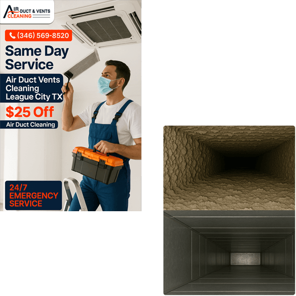Schedule your air duct cleaning appointment today with League City TX Air Duct Vents — enjoy cleaner air, same-day service, and a free estimate!